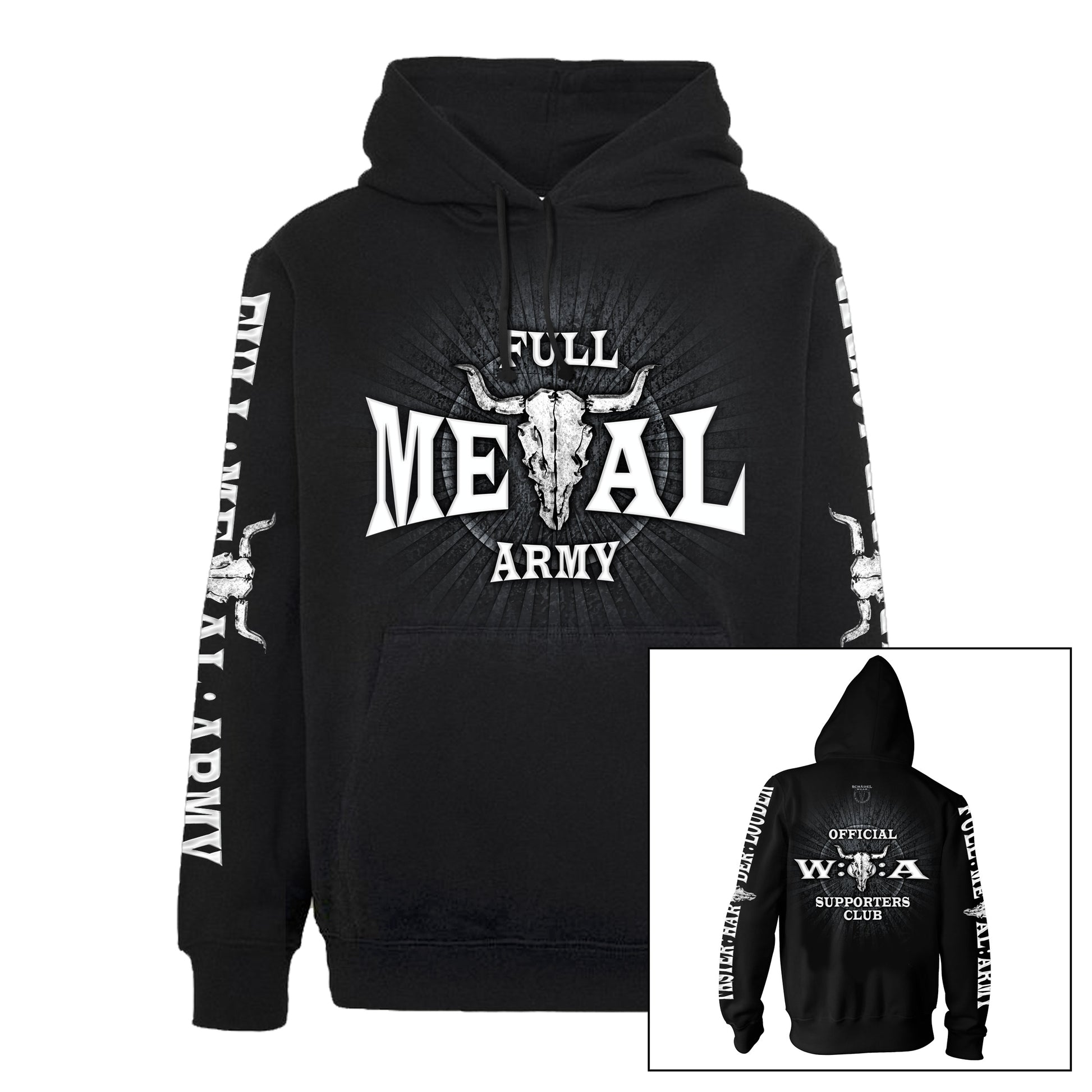 Auf der Vorderseite des Hoodie findet ihr das Hauptlogo der FULL : METAL : ARMY auf der Brust.